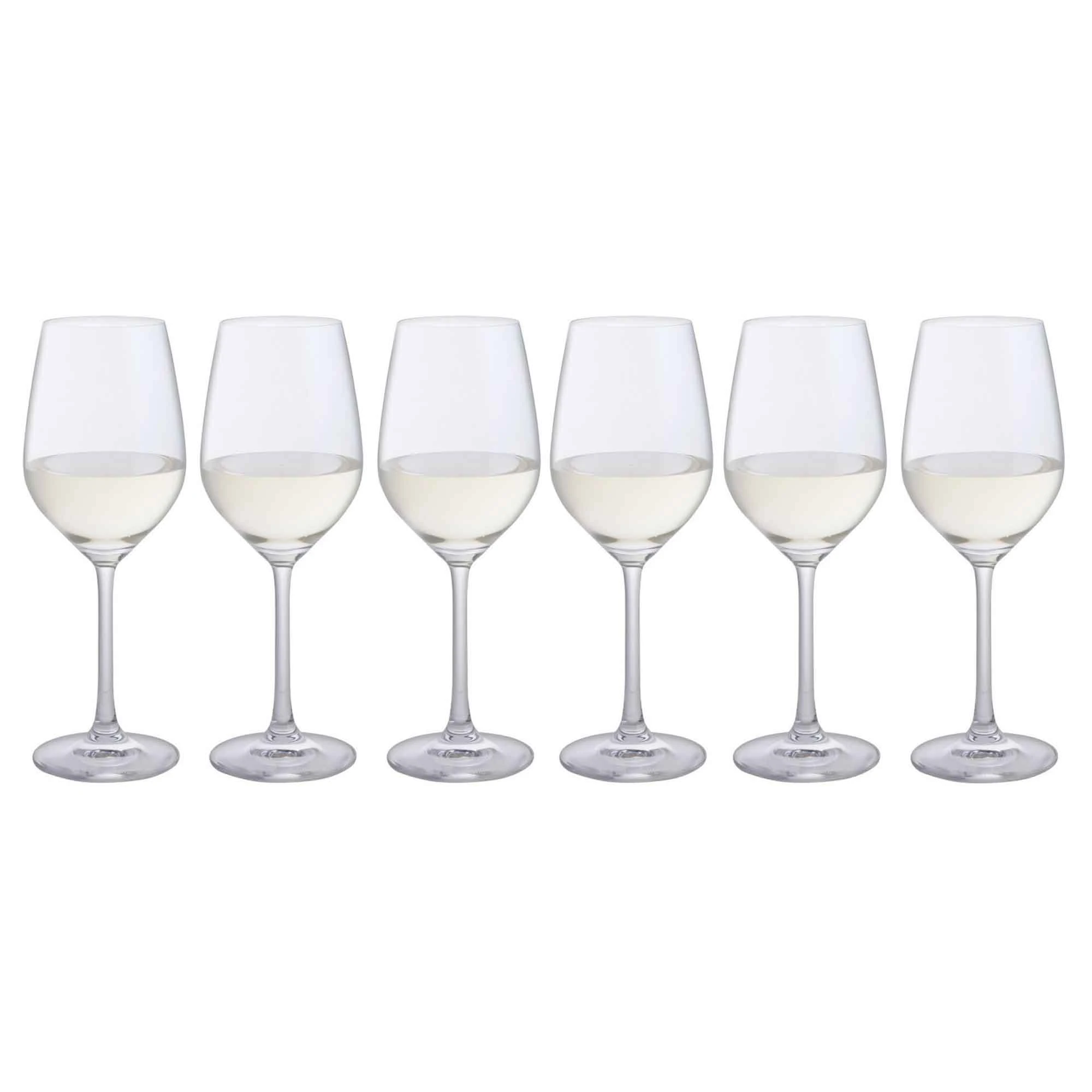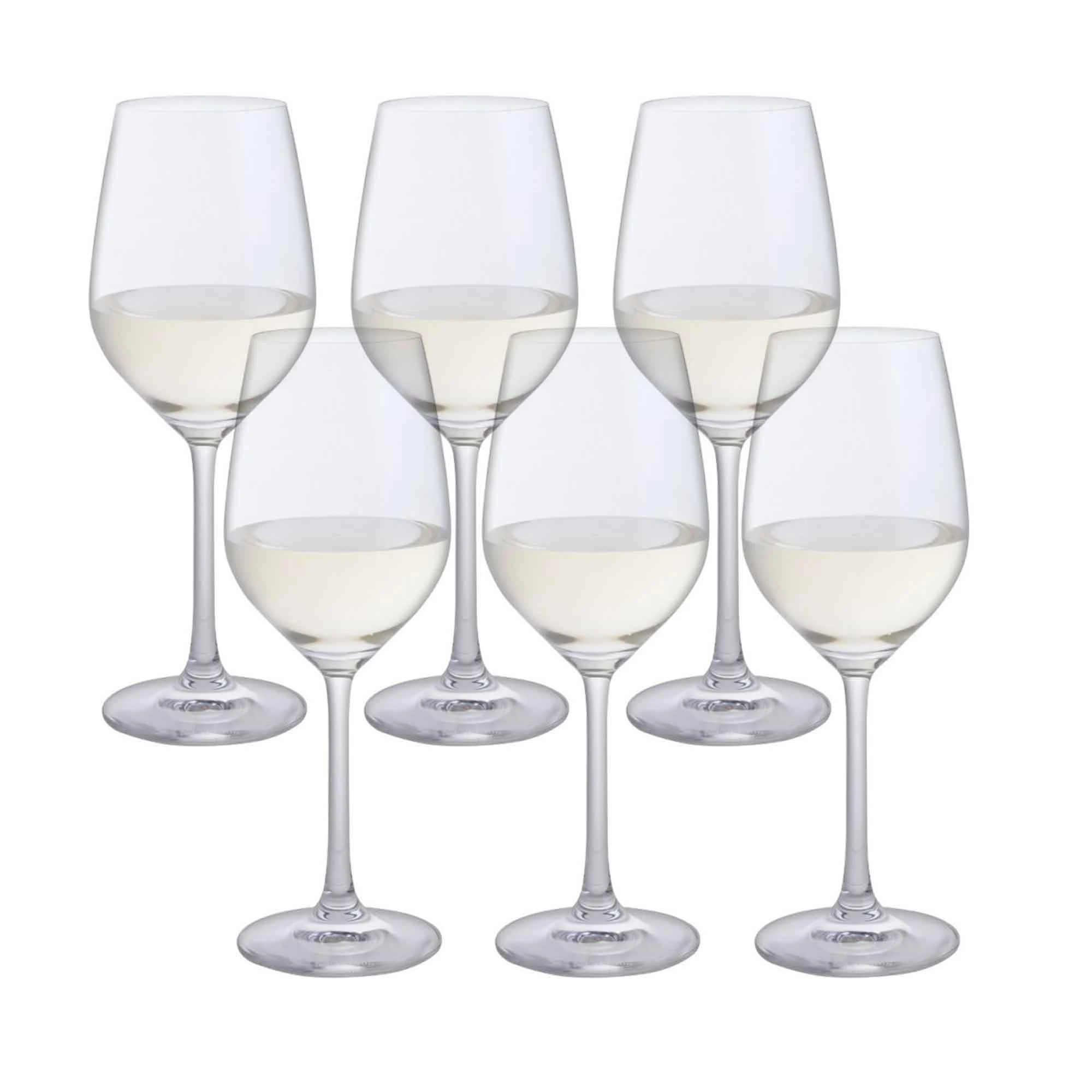 Set of six elegant white wine glasses that will add to your drinking pleasure. An ideal choice for any occasion or as a gift.