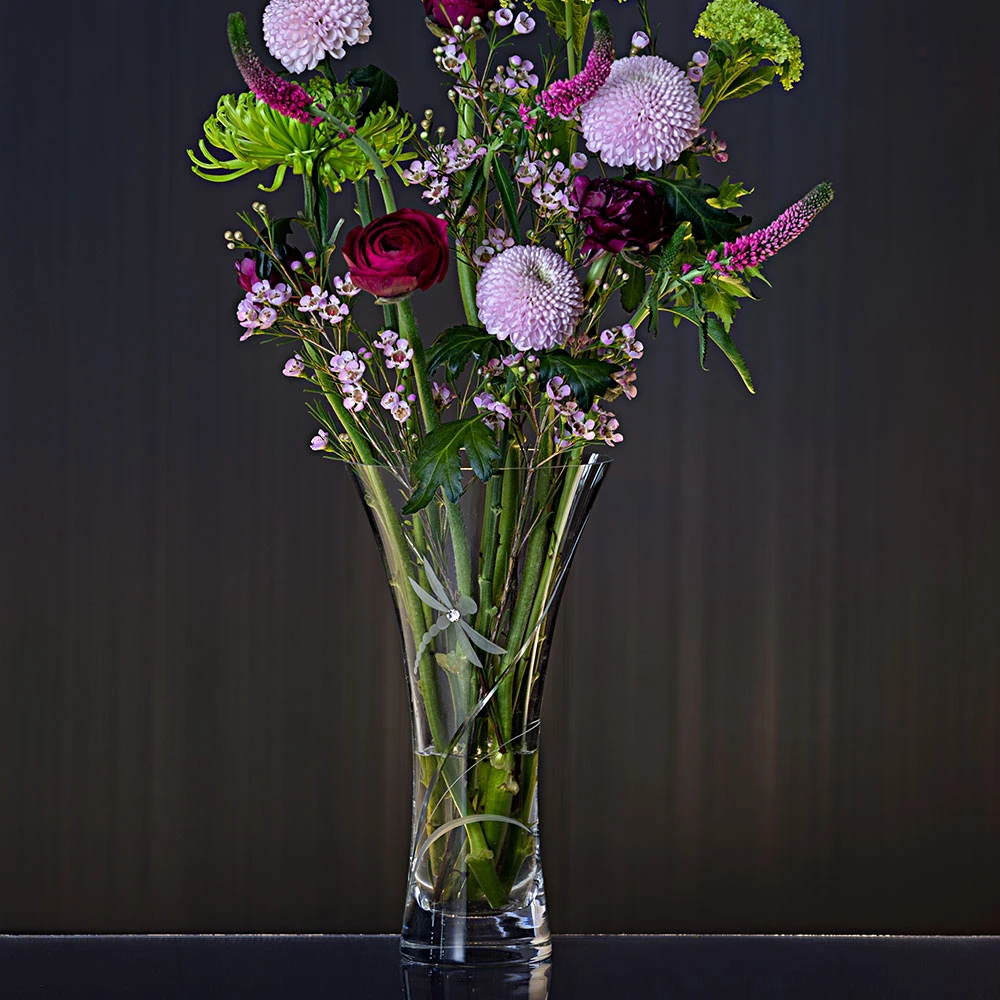 Embellished with Crystals from Swarovski ® and a hand engraved Dragonfly motif this lovely vase is a versatile choice suitable for most long stemmed flowers.